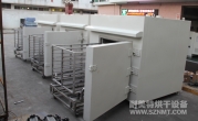 (8)烘干箱內可存放1輛推車。推車配置耐高溫角輪(定向輪、萬向輪各2個),推車里面安裝限位柱用于定位里面托盤,兩側配有L形托架,用于支撐及左右限位托盤。進出口裝有手動爐門。頂部部置循環風機、蒸氣換熱器等裝置,排廢風機安裝在爐體頂部。